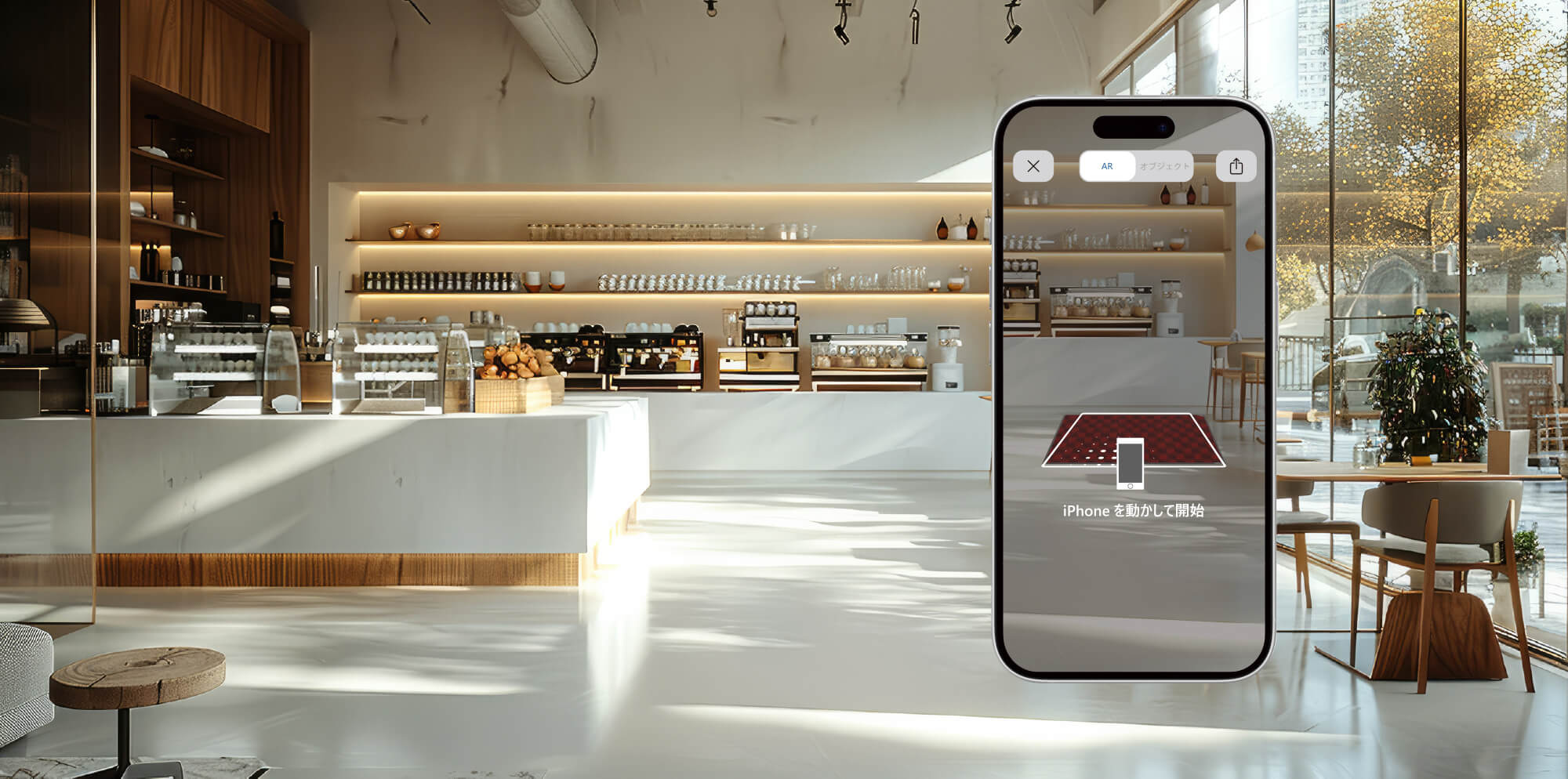 『LEASEPIA VISION』とは、スマートフォンでQRコードを読み取るだけで、カメラを通じてその場にバーチャルの商品を表示できるサービスです。ブラウザ上では、商品を360度どの視点からも確認することができ、色や質感までリアルに再現します。また、実寸大表示によりサイズの確認も可能で、お申込み後のミスマッチを防ぐのに役立ちます。